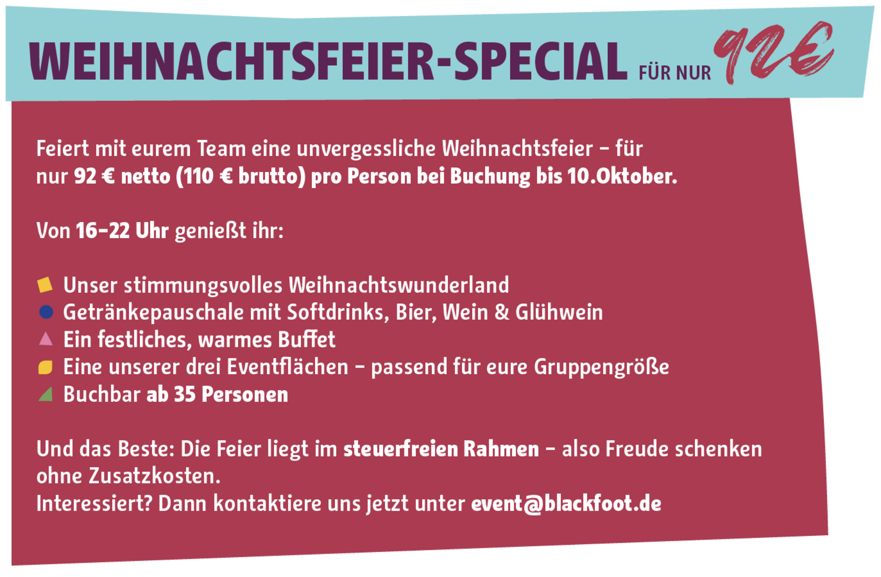 bei uns gibt es eine große Portion Weihnachten mit Lichterketten, Feuerkörben und Weihnachtsbäumen in gemütlicher Atmosphäre. Zu weihnachtlicher Stimmung könnt ihr mit den Kolleg:innen ganz gemütlich einen leckeren Glühwein auf einer unserer exklusiven Weihnachtseventlocations genießen. In winterlicher Atmosphäre und verzauberter Umgebung gibt es alles, was das Herz begehrt. Wählt nach freiem Belieben ein Aktivprogramm aus, sucht euch das passende Weihnachtsbuffet oder speist von unseren Winterlandhütten. Je nach Wochentag und Gruppengröße gibt es verschiedene Eventlocations.